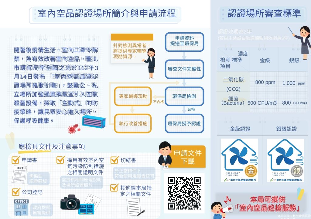 賀 享呼吸 空氣清淨器 榮獲台北市 室內空氣品質金級認證 首頁最新消息賀 享呼吸 空氣清淨器 榮獲台北市 室內空氣品質金級認證 享呼吸 智慧型空氣淨化器榮獲:台北市「室內空氣品質認證場所」金級認證臺北市政府於113年7月9日在市政大樓舉行環保局推出的「室內空氣品質場所認證」頒獎表揚大會。市長蔣萬安出席並發表致詞,除了表彰優良企業、機關及廠商對提升室內空氣品質的貢獻,也宣示將在未來三年,完成1115處公私場域的認證。蔣萬安表示,今天是環保局推出室內空氣品質場所認證的頒獎表揚大會。他提及,臺北市民平均80%的時間都待在室內,因此不論是辦公大樓、大賣場或醫療機構,室內空氣品質都是市民非常關心的課題,尤其中央機關最近也提到疫情逐步升溫,因此對空氣品質的要求更顯重要,非常感謝今天所有參與的優良企業、機關以及優秀的廠商代表。他表示,環保局於去年3月率全國之先推出臺北市室內空氣品質場所認證計劃,希望透過相關步驟和程序,給予場所空氣品質的認證並分等級,輔導團隊免費到各場所進行輔導和診斷,提供空氣品質改善措施,並由環保局實地查驗通過後給予認證,至今已有219家提出申請,其中135家經過認證獲得臺北市政府環保局的認證,包括護理之家、產後護理機構等。 如何申請認證?